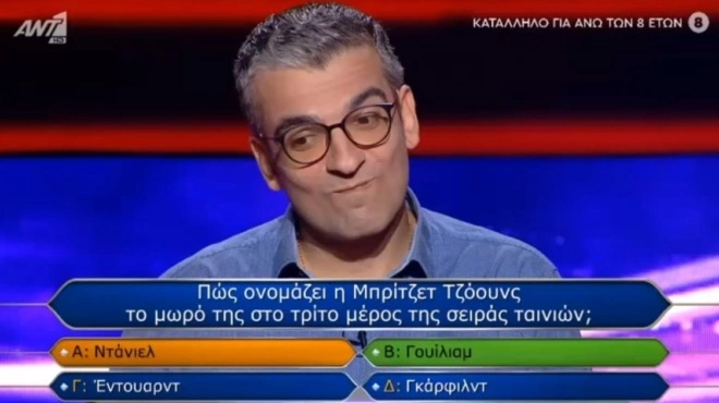 Η ερώτηση ήταν: «Πώς ονομάζει η Μπρίτζετ Τζόουνς το μωρό της στο τρίτο μέρος της σειράς ταινιών;» και οι απαντήσεις οι εξής: