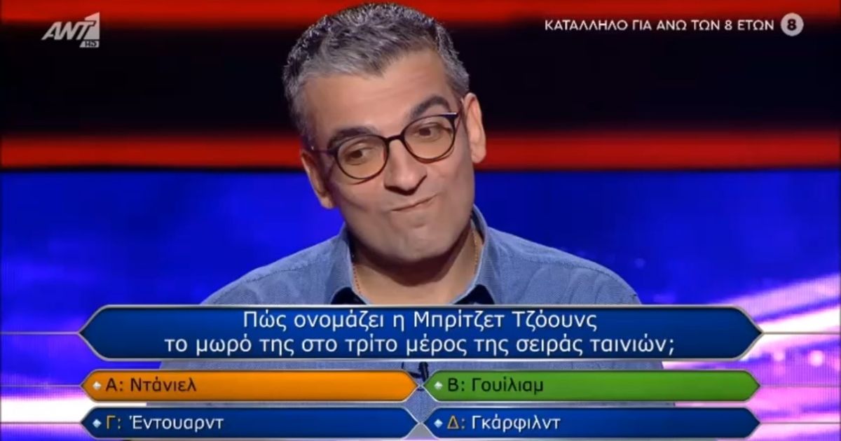 Η ερώτηση ήταν: «Πώς ονομάζει η Μπρίτζετ Τζόουνς το μωρό της στο τρίτο μέρος της σειράς ταινιών;» και οι απαντήσεις οι εξής: