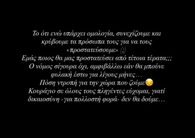 Ο νόμος σίγουρα όχι, αμφιβάλλω εάν θα μπούνε φυλακή έστω για λίγους μήνες… Πόση ντροπή για την χώρα που ζούμε. Κουράγιο σε όλους τους πληγέντες εύχομαι, γιατί δικαιοσύνη – για πολλοστή φορά – δεν θα δούμε…», ξέσπασε η Ιωάννα Τούνη.