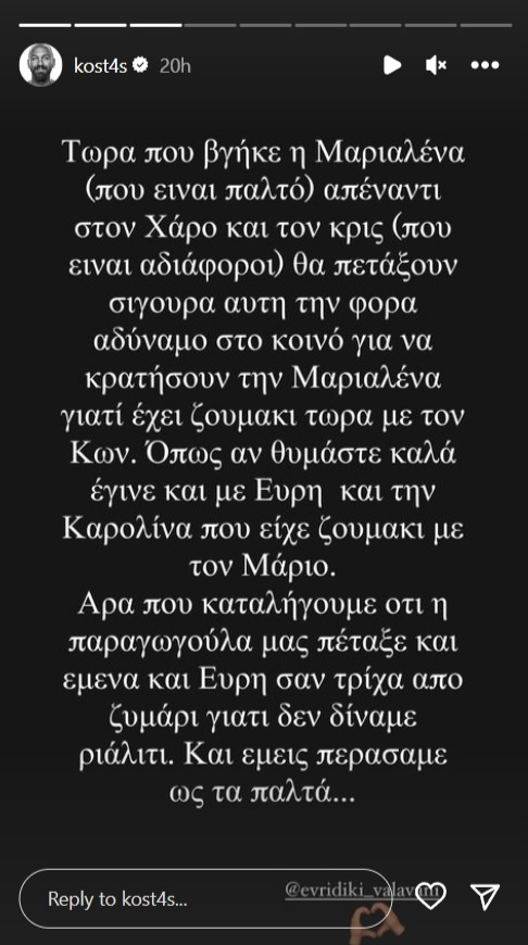 «Τώρα που βγήκε η Μαριαλένα (που είναι παλτό) απέναντι στον Χάρο και τον Κρις (που είναι αδιάφοροι) θα πετάξουν, σίγουρα, αυτήν τη φορά, αδύναμο στο κοινό, για να κρατήσουν τη Μαριαλένα, γιατί έχει ζουμάκι τώρα με τον Κωνσταντίνο. Όπως, αν θυμάστε καλά, έγινε και με Ευρυδίκη και την Καρολίνα που είχε ζουμάκι με τον Μάριο. Άρα, πού καταλήγουμε; Ότι η παραγωγούλα μάς πέταξε και εμένα και την Ευρυδίκη σαν τρίχα από ζυμάρι γιατί δεν δίναμε ριάλιτι. Και εμείς περάσαμε ως παλτά».