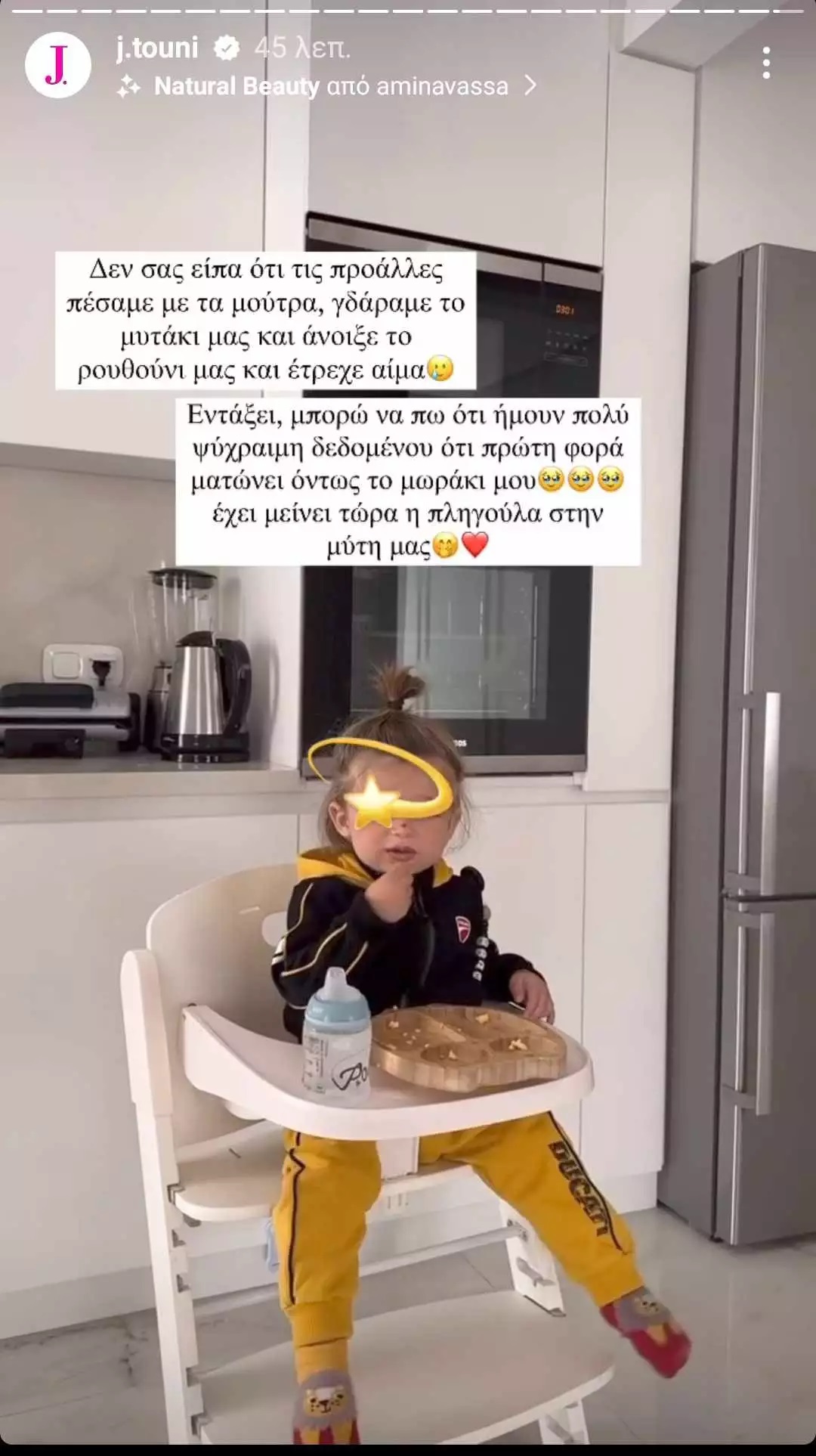 «Δε σας είπα ότι τις προάλλες πέσαμε με τα μούτρα, γδάραμε το μυτάκι μας και άνοιξε το ρουθούνι μας και έτρεχε αίμα. Εντάξει μπορώ να πω ότι ήμουν πολύ ψύχραιμη δεδομένου ότι πρώτη φορά ματώνει όντως το μωράκι μου. Έχει μείνει τώρα η πληγούλα στην μύτη μας», έγραψε η Ιωάννα Τούνη στα Instagram Stories της.