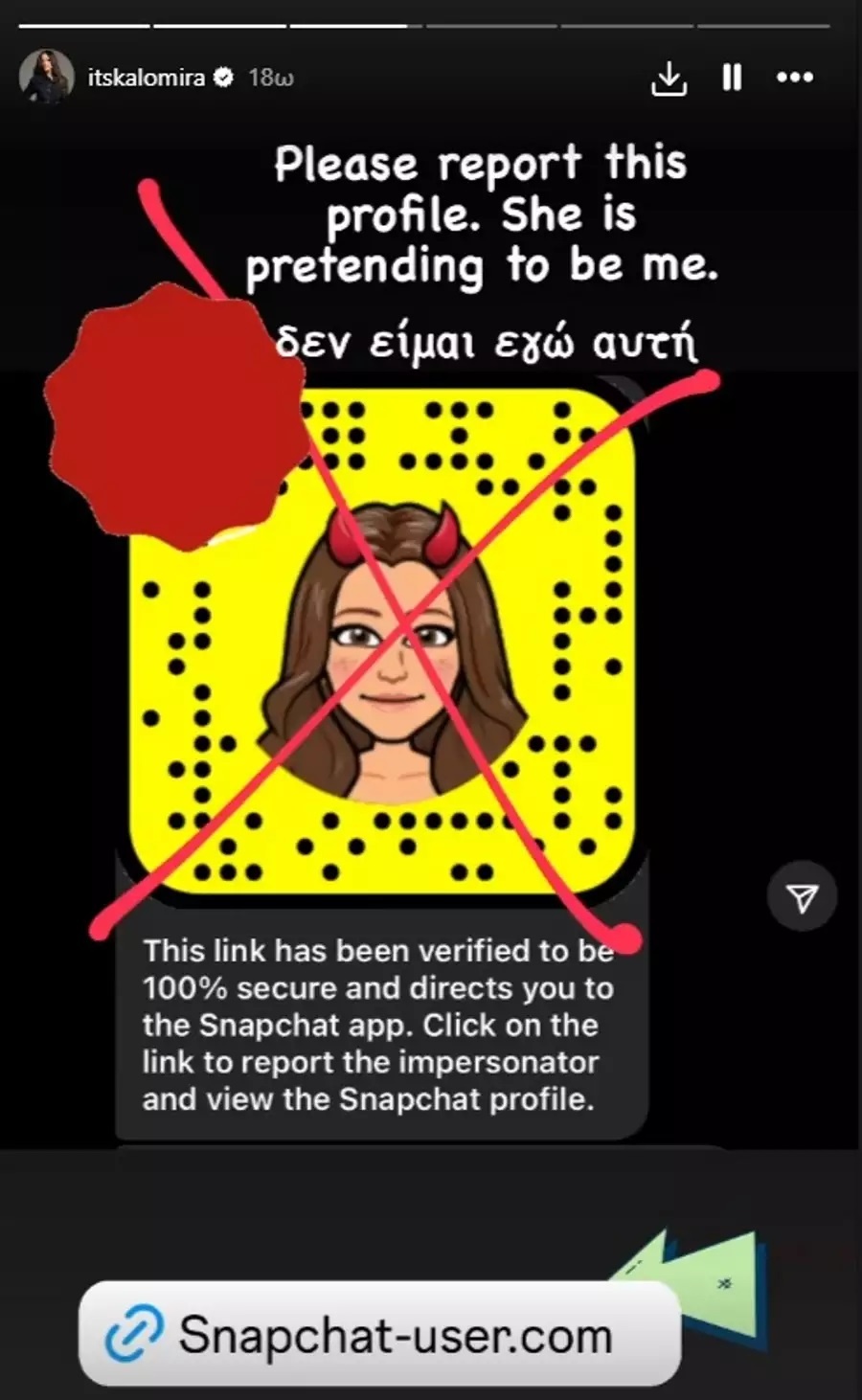«Κάποιος υποδύεται εμένα στο Snapchat και έχω ήδη κάνει report. Δεν είμαι εγώ. Προσοχή να το ξέρετε. Σας ευχαριστώ όλους όσους μου έστειλαν μήνυμα και με προειδοποίησαν» έγραψε η Καλομοίρα στα Instagram Stories της.