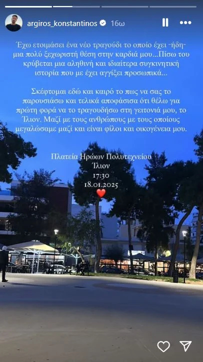 Απόψε λοιπόν (18/1) στις 17:30, ο Κωνσταντίνος Αργυρός καλεί μέσα από το Instagram story που έκανε, το κοινό και τους φίλους του από το Ίλιον, όπου και θα ερμηνεύσει το νέο του κομμάτι, στην Πλατεία Ηρώων Πολυτεχνείου.