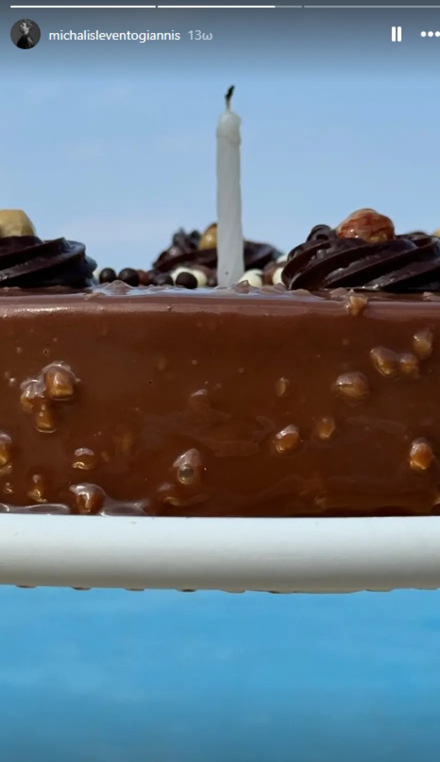 Σε άλλο στιγμιότυπο έδειξε τη σοκολατένια τούρτα με το κεράκι, που του ετοίμασε η παρέα του. Τα στιγμιότυπα έχουν φόντο το μπλε της θάλασσας αλλά και της πισίνας, χωρίς ωστόσο, να αποκαλύπτει που παραθερίζει.