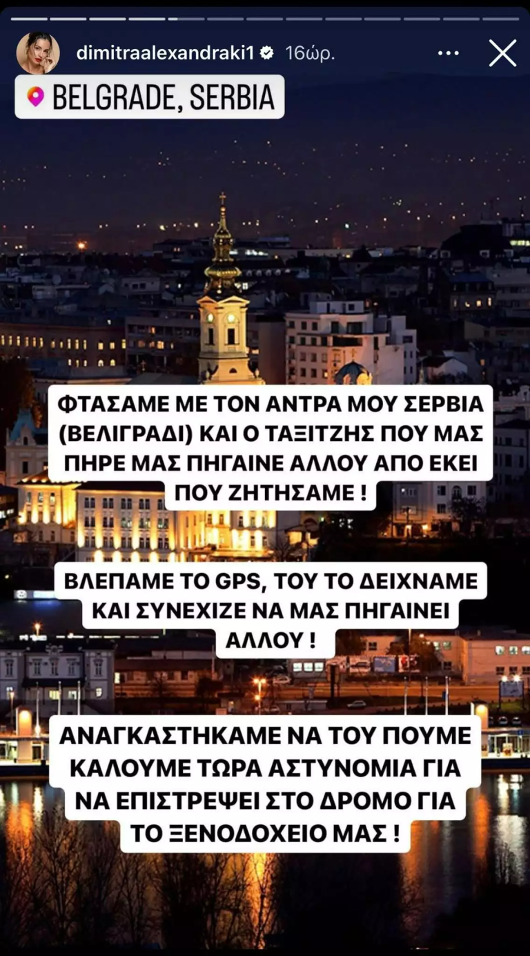 «Φτάσαμε με τον άνδρα μου Σερβία στο Βελιγράδι και ο ταξιτζής που μας πήρε μας πήγε αλλού από εκεί που συζητάμε. Βλέπαμε το GPS, του το δείχναμε και συνέχιζε να μας πηγαίνει αλλού. Αναγκαστήκαμε να του πούμε “Καλούμε τώρα την αστυνομία” για να επιστρέψει στο δρόμο για το ξενοδοχείο μας», έγραψε η Δήμητρα Αλεξανδράκη και συμπλήρωσε: