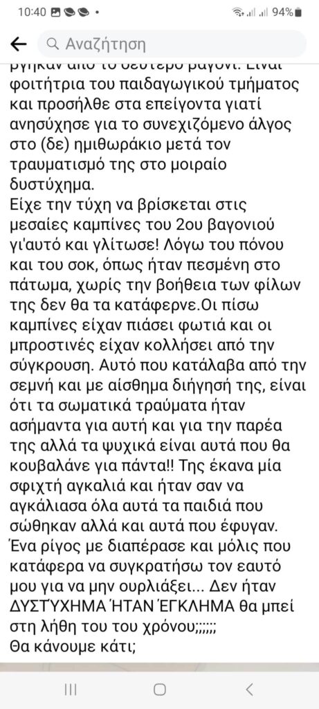 «Σήμερα 9/3/23 ήρθε στο ΤΕΠ το πανέμορφο κορίτσι της φωτογραφίας πού είναι ένα από τα δέκα παιδιά που βγήκαν από το BB δεύτερο βαγόνι. Είναι φοιτήτρια του παιδαγωγικού τμήματος και προσήλθε στα επείγοντα γιατί ανησύχησε για το συνεχιζόμενο άλγος στο (δε) ημιθωράκιο, μετά τον τραυματισμό της στο μοιραίο δυστύχημα. Είχε την τύχη να βρίσκεται στις μεσαίες καμπίνες του 2ου βαγονιού γι’αυτό και γλίτωσε! Λόγω του πόνου και του σοκ, όπως ήταν πεσμένη στο πάτωμα, χωρίς την βοήθεια των φίλων της δεν θα τα κατάφερνε. Οι πίσω καμπίνες είχαν πιάσει φωτιά και οι μπροστινές είχαν κολλήσει από την σύγκρουση. Αυτό που κατάλαβα από την σεμνή και με αίσθημα διήγησή της, είναι ότι τα σωματικά τραύματα ήταν ασήμαντα για αυτή και για την παρέα της αλλά τα ψυχικά είναι αυτά που θα κουβαλάνε για πάντα!! Της έκανα μία σφιχτή αγκαλιά και ήταν σαν να αγκάλιασα όλα αυτά τα παιδιά που σώθηκαν αλλά και αυτά που έφυγαν. Ένα ρίγος με διαπέρασε και μόλις που κατάφερα να συγκρατήσω τον εαυτό μου για να μην ουρλιάξει… Δεν ήταν ΔΥΣΤΎΧΗΜΑ ΉΤΑΝ ΈΓΚΛΗΜΑ».