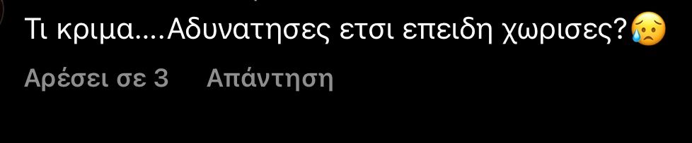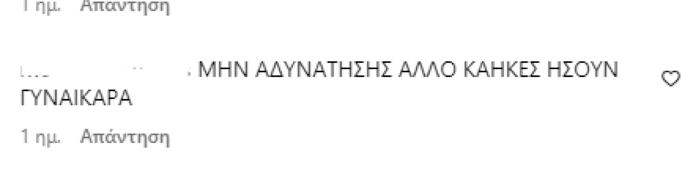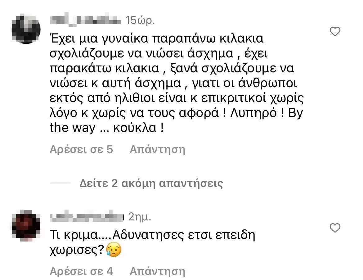 Τα άσχημα σχόλια ποικίλαν με τα πιο κλασσικά όπως “Πολύ αδύνατη κορίτσι μ πάρε λίγα κιλά ..❤️” μέχρι και σχόλια για το αν φταίει ένας χωρισμός για το σώμα της και τα κιλά της