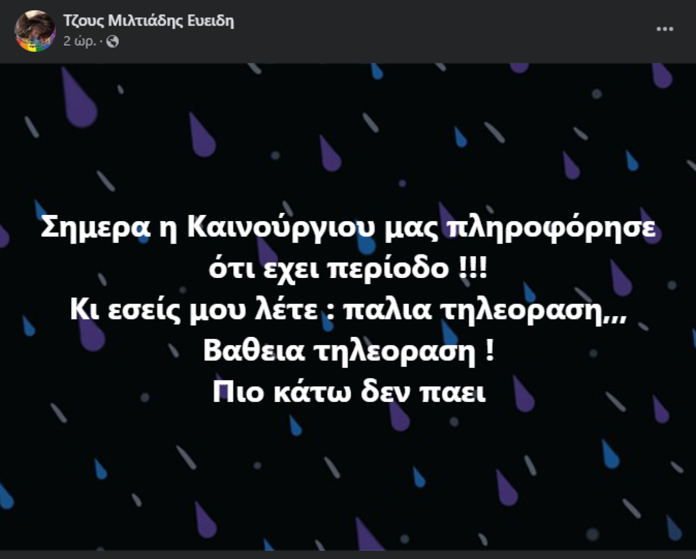 Πιο συγκεκριμένα, η Κατερίνα Καινούργιου κατά τη διάρκεια της εκπομπής της είπε, «Μπορούμε να γίνουμε Ισπανία; Στην Ισπανία, θα το πω, ψηφίστηκε όταν οι γυναίκες είναι στις δύσκολες μέρες του μήνα να παίρνουν αυτή την άδεια. Δε καταλαβαίνετε πόσο δύσκολο είναι για μας. Αλήθεια πρέπει να συμβεί και στην Ελλάδα αυτό… Πιεζόμαστε πολύ ψυχολογικά. Δεν έχω νεύρα γιατί έχω χαπακωθεί. Δε γίνεται αυτός ο πόνος. Γελάτε, δε καταλαβαίνετε τι τραβάμε».