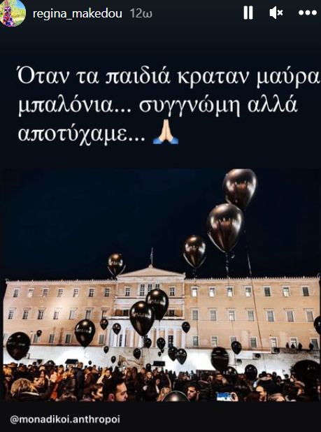 Τέλος, το βράδυ της Παρασκευής 3 Μαρτίου, έκανε επίσης αναδημοσίευση στα stories της μια εικόνας από τον δημοφιλή λογαριασμό Μοναδικοί Άνθρωποι. Πρόκειται για ένα στιγμιότυπο από τη συγκέντρωση νέων στο Σύνταγμα, κρατώντας μαύρα μπαλόνια στη μνήμη όσων χάθηκαν τόσο άδικα.