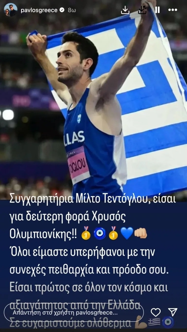 «Συγχαρητήρια Μίλτο Τεντόγλου, είσαι για δεύτερη φορά Χρυσός Ολυμπιονίκης. Όλοι είμαστε υπερήφανοι με την πειθαρχία και την πρόοδο σου. Είσαι πρώτος σε όλον τον κόσμο και αξιαγάπητος στην Ελλάδα. Σε ευχαριστούμε ολόθερμα».