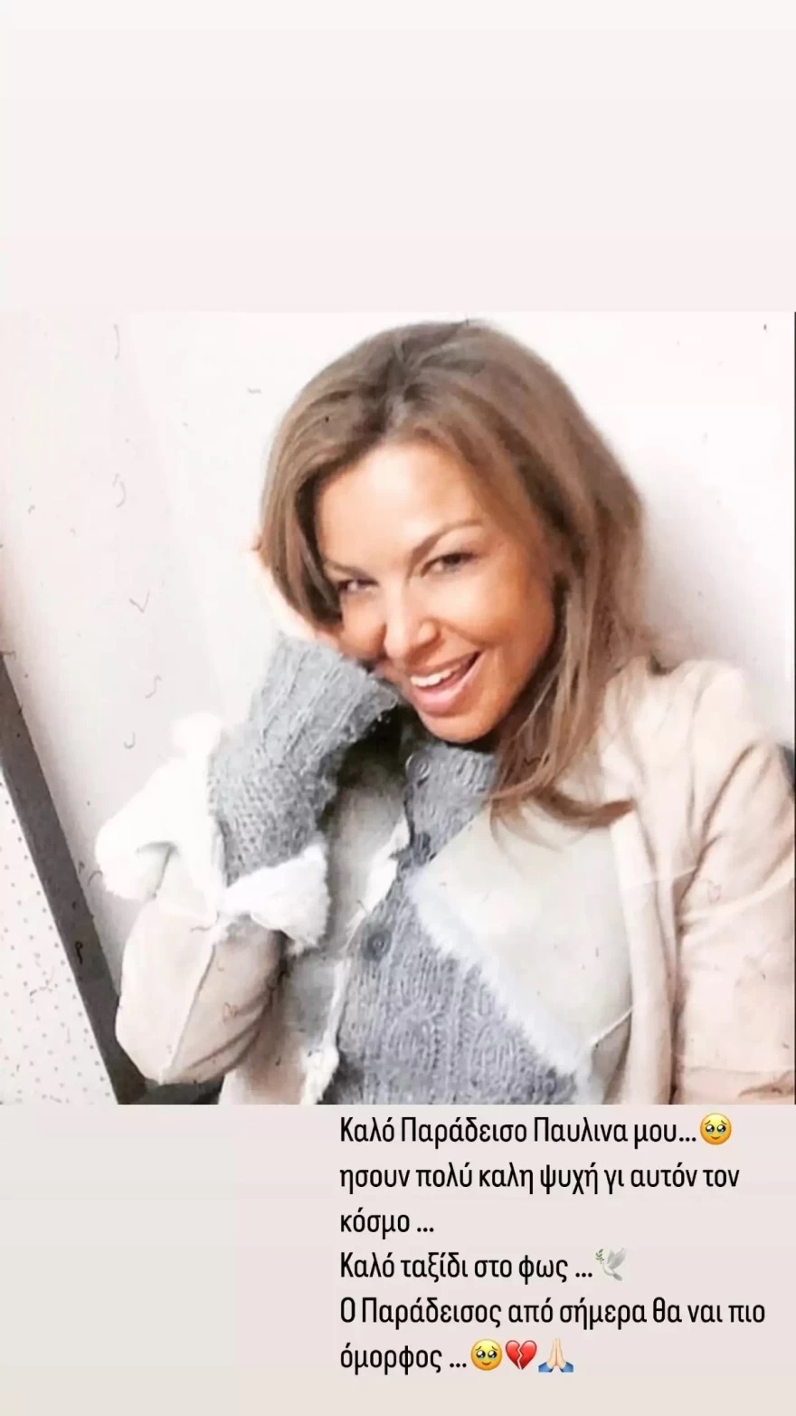 Η Κατερίνα Καινούργιου, η οποία δημοσίευσε ένα story στον προσωπικό της λογαριασμό στο Instagram με μία φωτογραφία της και σημείωσε χαρακτηριστικά: «Καλό Παράδεισο Παυλίνα μου… ήσουν πολύ καλή ψυχή για αυτόν τον κόσμο… Καλό ταξίδι στο φως… Ο παράδεισος από σήμερα θα είναι πιο όμορφος…».