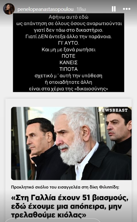«Αφήνω αυτό εδώ ως απάντηση σε όλους όσοι αναρωτιούνται γιατί δεν πάω στο δικαστήριο. Γιατί δεν άντεξα άλλο την παράνοια για αυτό. Και μη με ξαναρωτήσει ποτέ κανείς, τίποτα σχετικό με αυτή την υπόθεση ή οποιαδήποτε άλλη είναι στα χέρια της «δικαιοσύνης» έγραψε η Πηνελόπη Αναστασοπούλου.