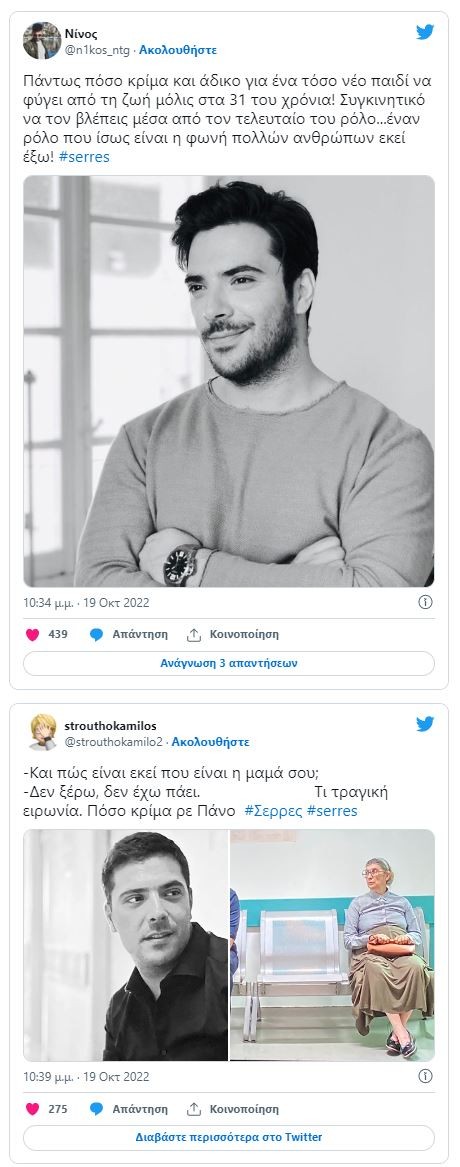 Πάγωσαν όλοι με τις σκηνές του αδικοχαμένου ηθοποιού Πάνου Νάτση, όταν τις είδαν στη τηλεοπτική σειρά Σέρρες ενώ οι χρήστες του twitter αναφωνούσαν “Πόσο κρίμα ρε Πάνο”.