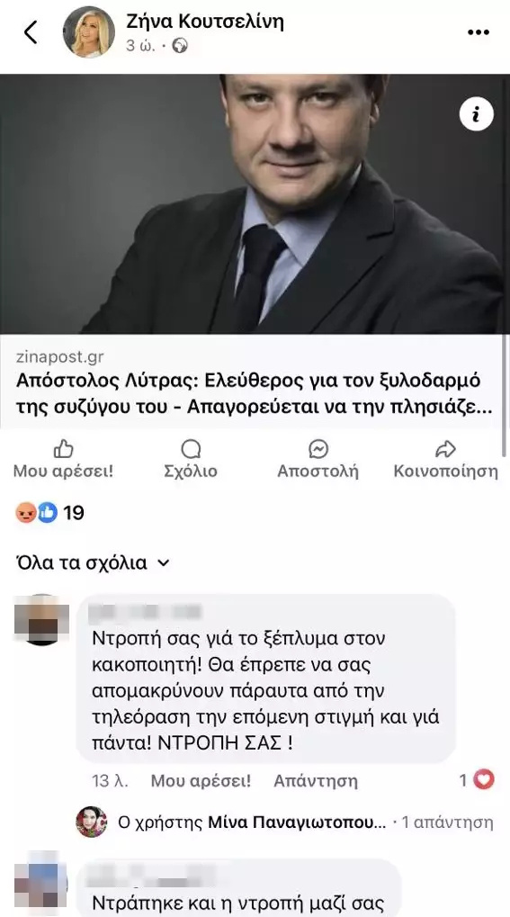 Οργή στο διαδίκτυο για την Ζήνα Κουτσελίνη μετά τα όσα δήλωσε στον αέρα της εκπομπής για τον Απόστολο Λύτρα ο οποίος κατηγορείται για το άγριο ξυλοδαρμό της συζύγου του, Σοφία Πολυζωγοπούλου.