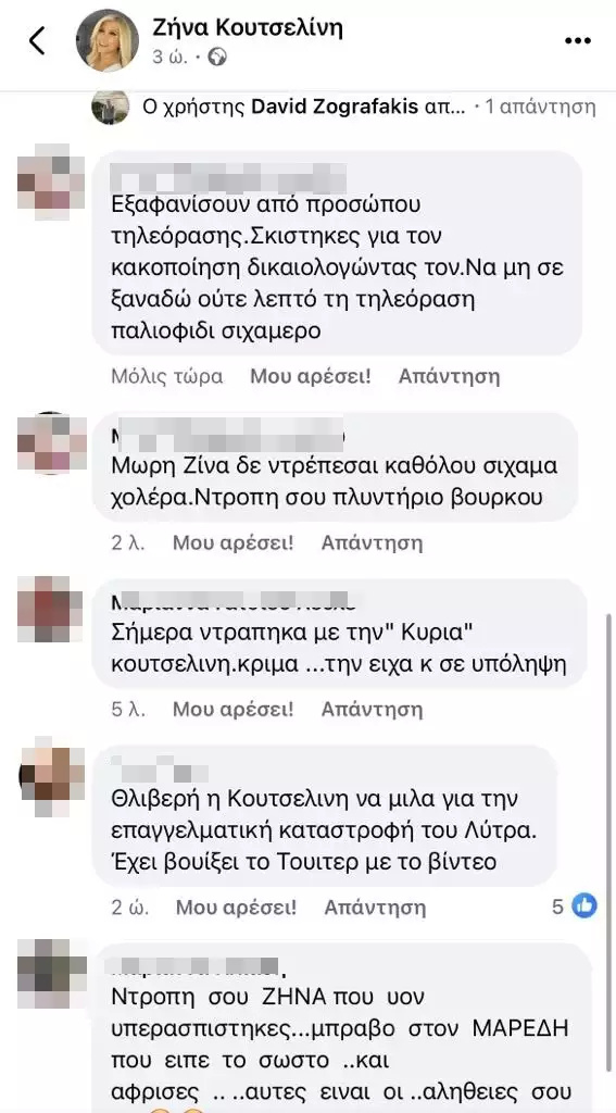 Σε όλα τα social media και κάτω από αναρτήσεις της Ζήνας Κουτσελίνη, οι followers της ξεσπούν εις βάρος της, κατηγορώντας την ουσιαστικά για ξέπλυμα του ποινικολόγου.