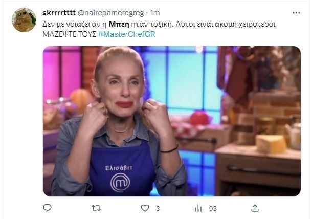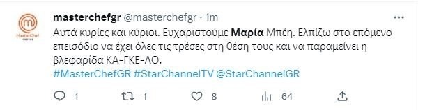 Το καλύτερο σχόλιο ήρθε από το επίσημο προφίλ του Star για το MasterChef στο τέλος του επεισοδίου: «Αυτά κυρίες και κύριοι. Ευχαριστούμε Μαρία Μπέη. Ελπίζω στο επόμενο επεισόδιο να έχει όλες τις τρέσες στη θέση τους και να παραμείνει η βλεφαρίδα ΚΑ-ΓΚΕ-ΛΟ».