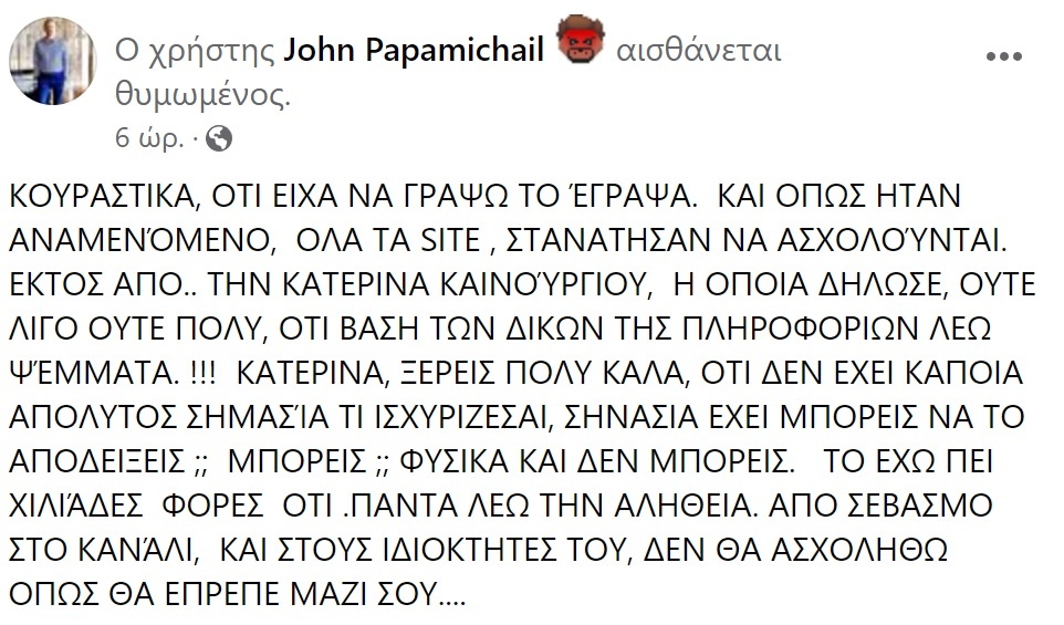 Κατερίνα ξέρεις πολύ καλά ότι δεν έχει κάποια απολύτως σημασία τι ισχυρίζεσαι. Σημασία έχει μπορείς να το αποδείξεις. Μπορείς; Φυσικά και δεν μπορείς. Το έχω πει χιλιάδες φορές ότι πάντα λέω την αλήθεια. Από σεβασμό στο κανάλι και στους ιδιοκτήτες του δεν θα ασχοληθώ όπως θα έπρεπε μαζί σου», έγραψε ο Γιάννης Παπαμιχαήλ.
