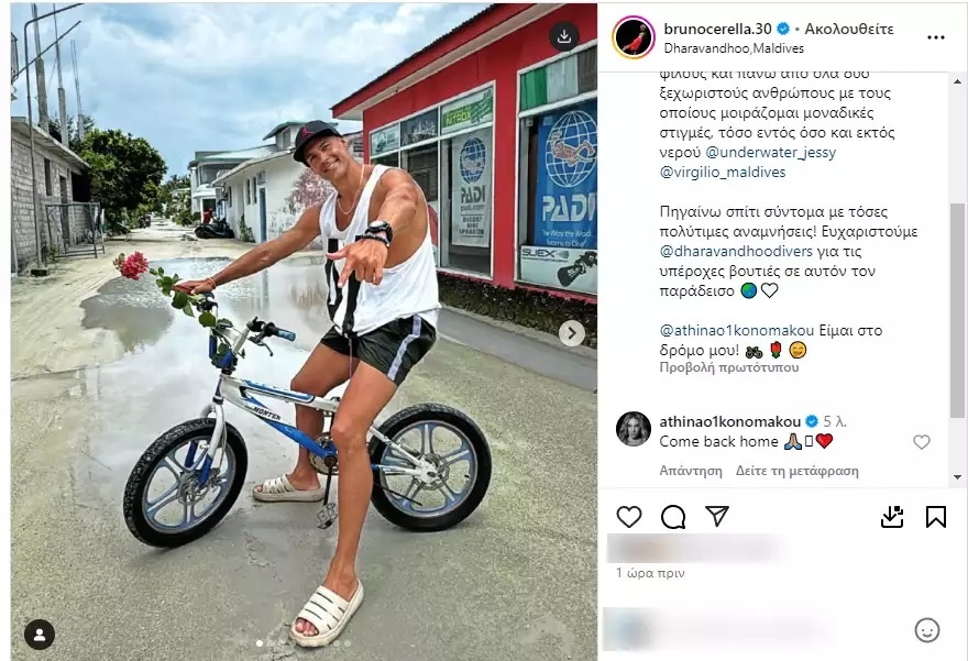Πριν λίγες ώρες ο Μπρούνο Τσερέλα δημοσίευσε φωτογραφίες από το ταξίδι του στις Μαλδίβες, περιγράφοντας στη λεζάντα το πώς πέρασε. Μάλιστα, δεν δίστασε να αναφερθεί και στην Αθηνά Οικονομάκου, γράφοντας «Είμαι στον δρόμο» και εννοώντας ότι “τρέχει” πίσω στην Ελλάδα για να τη βρει.