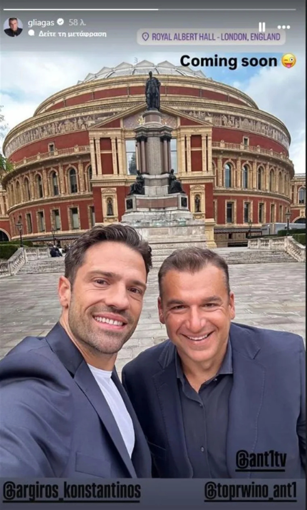 «Έρχεται σύντομα», έγραψε ο Γιώργος Λιάγκας στη φωτογραφία που δημοσίευσε στο Instagram και ποζάρει έξω από το Royal Albert Hall μαζί με τον Κωνσταντίνο Αργυρό.