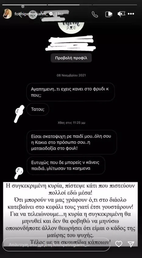To 2019, η Φωτεινή Πετρογιάννη είχε γράψει ξανά τις σκέψεις της για τα μηνύματα μίσους στα social media.