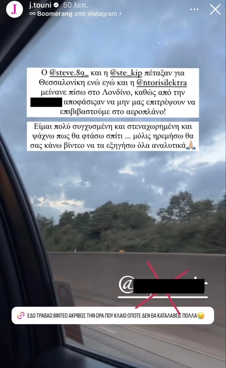 «Είμαι πολύ συγχυσμένη και στεναχωρημένη και ψάχνω πώς θα φτάσω σπίτι. Μόλις ηρεμήσω θα κάνω βίντεο να τα εξηγήσω όλα αναλυτικά», έγραψε στο instagram η Ιωάννα Τούνη η οποία δημοσίευσε και το όνομα της αεροπορικής εταιρίας.