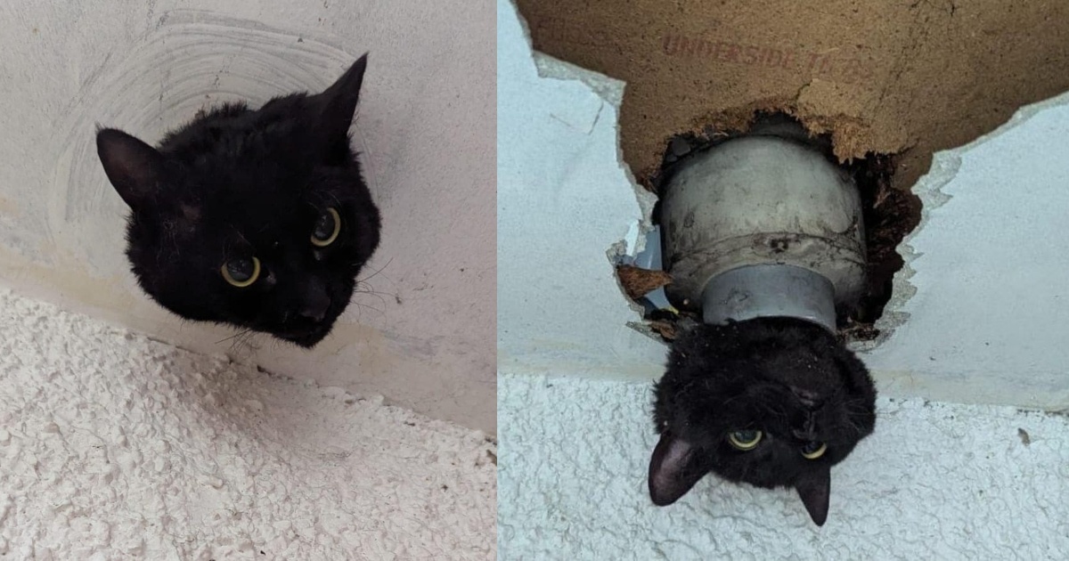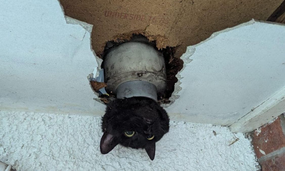Το θηλυκό γατί, που ονομάζεται Τζον, βρέθηκε με το κεφάλι του κολλημένο στην άκρη του σωλήνα, ο οποίος ήταν συνδεδεμένος με ένα γκαράζ.