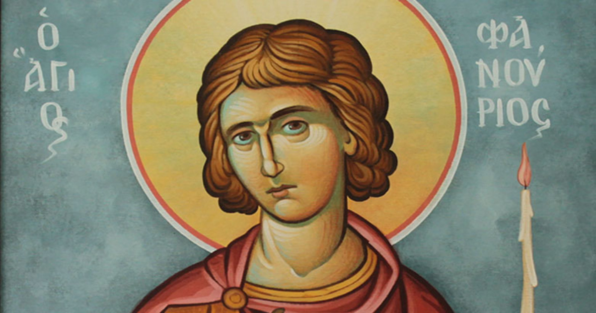 Με το δεξί χέρι ο νεαρός πολεμιστής κρατά μακρύ δόρυ και με το αριστερό στηρίζει ασπίδα ακουμπισμένη στο έδαφος. Στο ίδιο χέρι κρατά σταυρό με αναμμένη λαμπάδα στην πάνω κατακόρυφη κεραία του. Έτσι συνήθως παριστάνεται ο «νεοφανής» άγιος Φανούριος σε μια ομάδα από τις παλαιότερες φορητές εικόνες του.