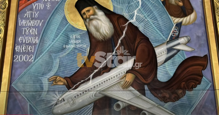 Ξαφνικά βλέπει από το δικό του παράθυρο τον Άγιο Ιάκωβο, με τα ράσα φουσκωμένα από τον αέρα, να απλώνει το χέρι του κάτω από το αεροπλάνο και να σταματά την πτώση του!