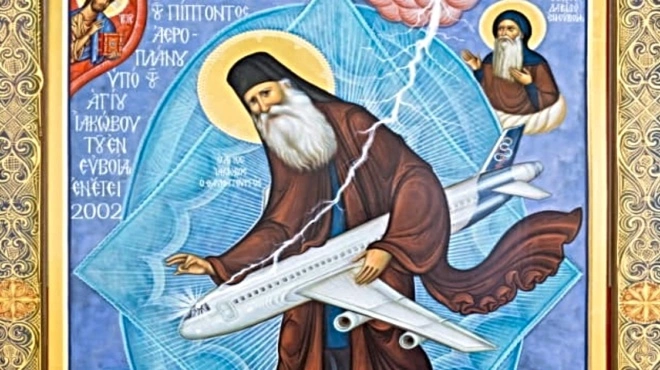 Ξαφνικά βλέπει από το δικό του παράθυρο τον Άγιο Ιάκωβο, με τα ράσα φουσκωμένα από τον αέρα, να απλώνει το χέρι του κάτω από το αεροπλάνο και να σταματά την πτώση του!