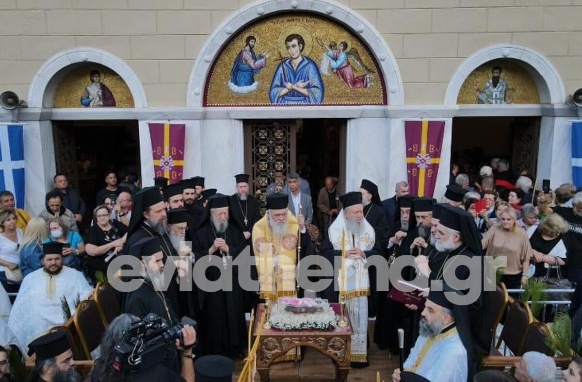 Ο Αρχιεπίσκοπος Αθηνών κ.κ. Ιερώνυμος και ο Μητροπολίτης Χαλκίδος κ.κ. Χρυσόστομος τέλεσαν την επίσημη υποδοχή του ιερού λειψάνου, παρουσία πλήθους πιστών.