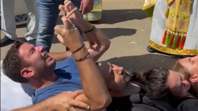 Άβολες εικόνες κάνουν τον γύρο του διαδικτύου από τη λιτανεία του Αγίου Γερασίμου στην Κεφαλονιά, όπου ένας άνδρας σε κατάσταση που οι παρευρισκόμενοι περιγράφουν ως «δαιμονισμό» έκλεψε την παράσταση και προκάλεσε αμηχανία στους πιστούς.
