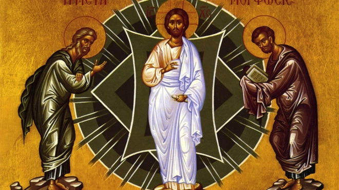 Οι τρεις μαθητές Του, όπως ήταν κουρασμένοι από τη δύσκολη ανάβαση στο Θαβώρ και ενώ κάθισαν να ξεκουραστούν, έπεσαν σε βαθύ ύπνο. Όταν, ξύπνησαν, αντίκρισαν απροσδόκητο και εξαίσιο θέαμα. Το πρόσωπο του Κυρίου άστραφτε σαν τον ήλιο, και τα φορέματα Του ήταν λευκά σαν το φως.