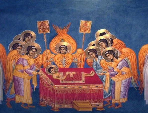 Πλημμυρισμένοι οι άγγελοι από τη μετοχή τους στη θεία μακαριότητα δοξολογούν αέναα τον Δημιουργό τους, ως έκφραση υπέρτατης ευγνωμοσύνης.