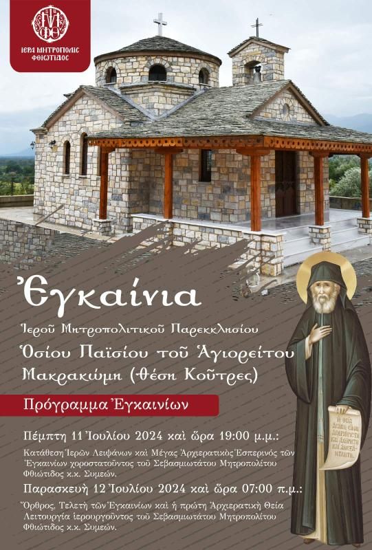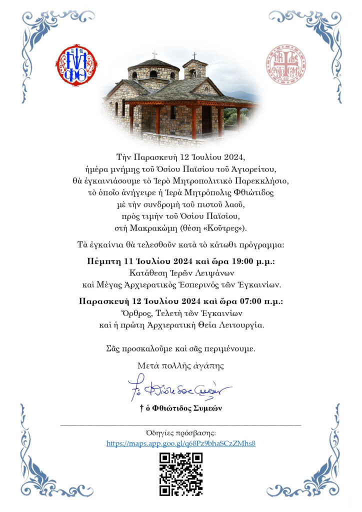 Στις 07:00 π.μ. θα τελεσθεί Όρθρος, Τελετή των Εγκαινίων και η πρώτη Αρχιερατική Θεία Λειτουργία στο Ιερό Μητροπολιτικό Παρεκκλήσιο του Οσίου Παϊσίου του Αγιορείτου στη θέση «Κούτρες Μακρακώμης, ἱερουργοῦντος τοῦ Σεβασμιωτάτου Μητροπολίτου μας κ.κ. Συμεών.