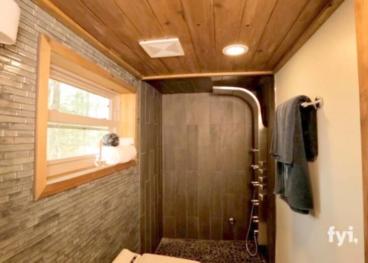 Ακόμα και το μπάνιο είναι ευρύχωρο και φαίνεται απίστευτα πολυτελές με πλακάκια στους τοίχους και λεπτομέρειες από ανοξείδωτο χάλυβα.