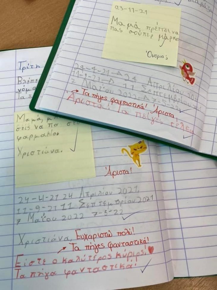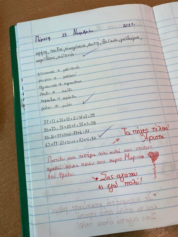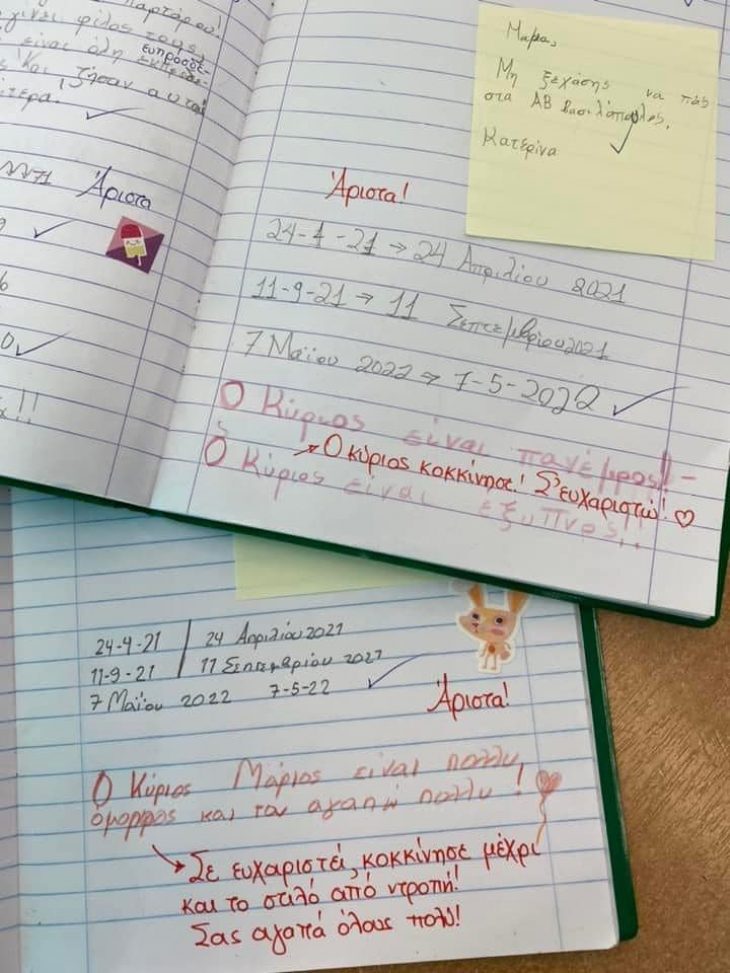 Κοιτάζοντας τα σχόλια που έγραψε στα τετράδια των μαθητών του καταλαβαίνει εύκολα κανείς ότι όχι μόνο αγαπά το λειτούργημα του δασκάλου αλλά και τους λόγους που αποτελεί ένα λαμπρό παράδειγμα προς μίμηση.