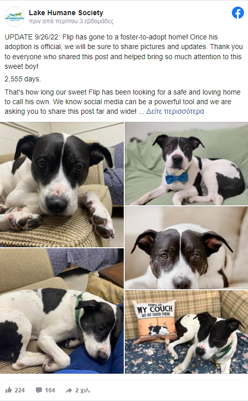 Κάπως έτσι, ήρθε σε επαφή με την φιλοζωική οργάνωση Lake Humane Society ζητώντας να υιοθετήσει τον Φλιπ – ο οποίος βρισκόταν σε σπίτι αναδόχων.