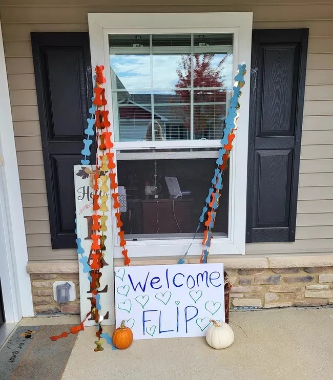 Σύμφωνα με πληροφορίες από το περιοδικό People, η Τζένιφερ Σορ, αναπληρώτρια διευθύντρια του τμήματος εκπαίδευσης στο ίδρυμα Buckeye Community Hope Foundation, έμαθε την ιστορία του Φλιπ μέσω μιας ανάρτησης στο Facebook και μιας έκκλησης να βρεθεί ένα σπίτι για τον σκυλάκο.