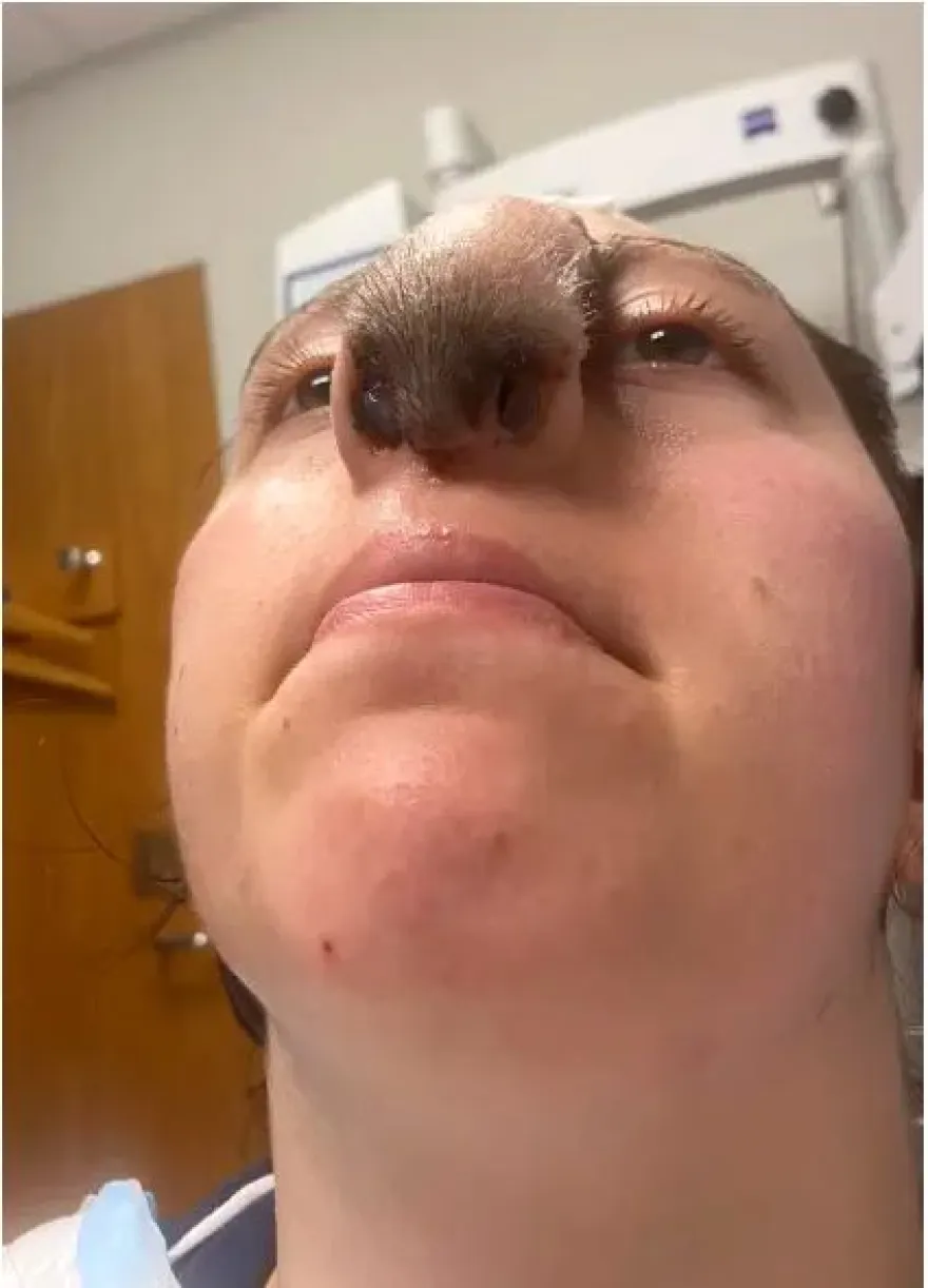 Το μόσχευμα δέρματος που χρησιμοποιήθηκε από την κορυφή του τριχωτού της κεφαλής της, προκαλεί τριχοφυΐα στην ανακατασκευασμένη μύτη της.