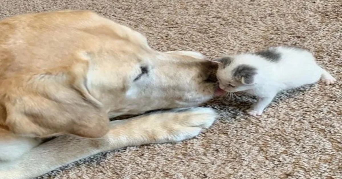Το γλυκό λαμπραντόρ συνάντησε το γατάκι αφού της έκαναν πρώτα μπάνιο. Το μικρό γατάκι κουλουριάστηκε δίπλα του και κοιμήθηκε αμέσως.
