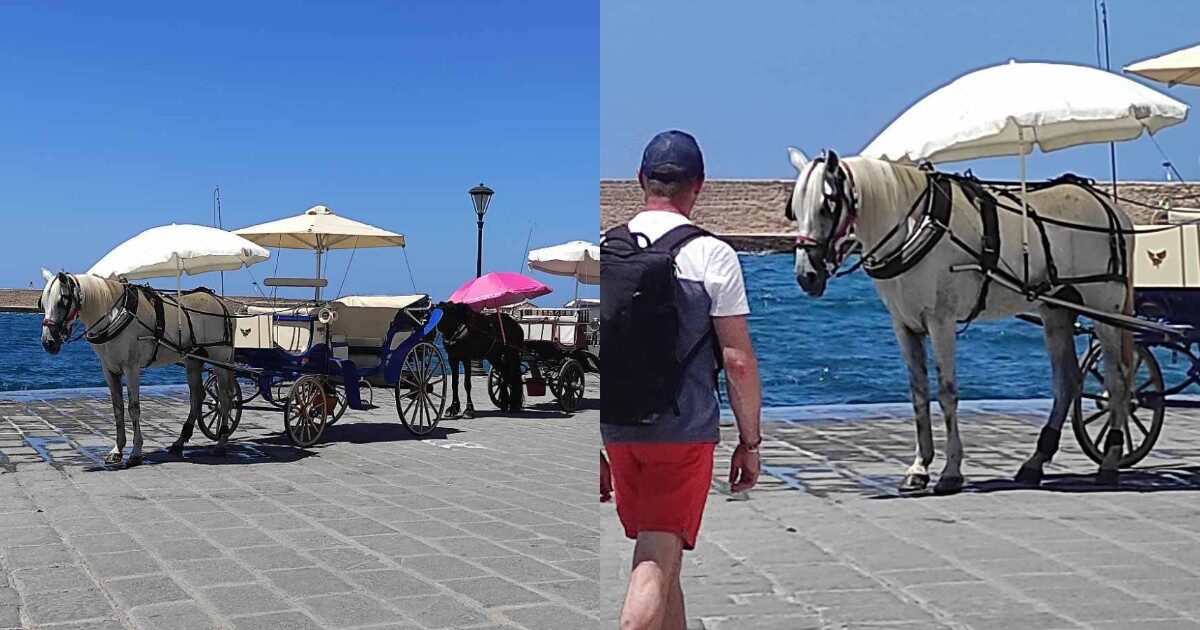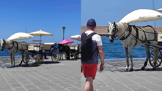 Σύμφωνα με καταγγελία της φιλοζωικής σελίδας των Χανίων «Η προστασία των ζώων», τα άλογα άμαξας περιμένουν τον επόμενο πελάτη κάτω από τον καυτό ήλιο και τη θερμοκρασία να αγγίζει τους 40 βαθμούς Κελσίου.