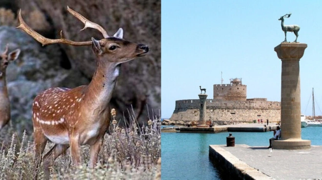 Το ροδίτικο πλατόνι (Dama dama), σύμβολο της Ρόδου που κοσμεί τα δάση του νησιού εδώ και πολλά χρόνια και αποτελεί μέρος των παραδόσεών του, είναι ένα από τα λίγα είδη ευρωπαϊκών ελαφιών που έχουν επιβιώσει μέχρι σήμερα. Δύο αγάλματα ελαφιών, ένα αρσενικό και ένα θηλυκό, είναι τοποθετημένα σε στύλους και εκτίθενται εκατέρωθεν της εισόδου του παλιού λιμανιού της πόλης.