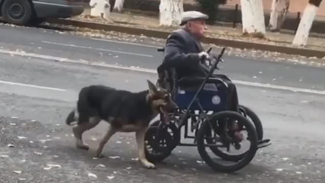 Ο σκύλος, που σύμφωνα με πληροφορίες είναι η μοναδική οικογένεια που έχει ο Ντερμπένεφ, δεν συνοδεύει απλώς το αφεντικό του, αλλά συχνά πηγαίνει πίσω από το καρότσι και μπαίνει από κάτω, ώστε να το σπρώξει με το σώμα του και να βοηθήσει τον 70χρονο στην κίνησή του.