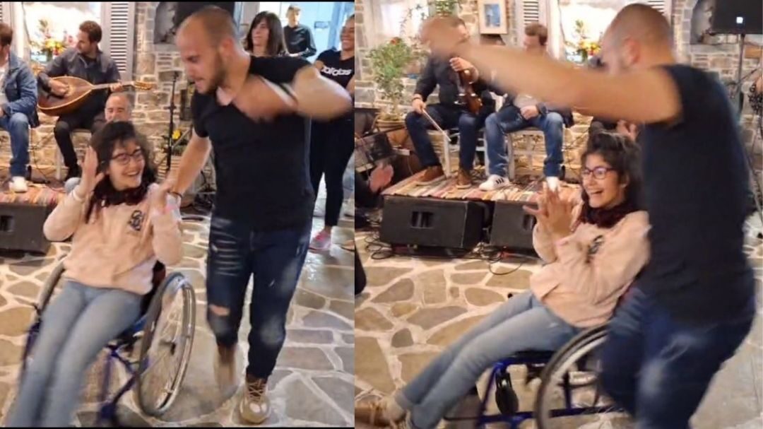 Η Αργυρώ, από το χωριό Θολάρια της Αμοργού, χόρεψε, την ημέρα των γενεθλίων της, «μπάλο» συνοδεία ενός φίλου της όντας σε ένα αναπηρικό αμαξίδιο.
