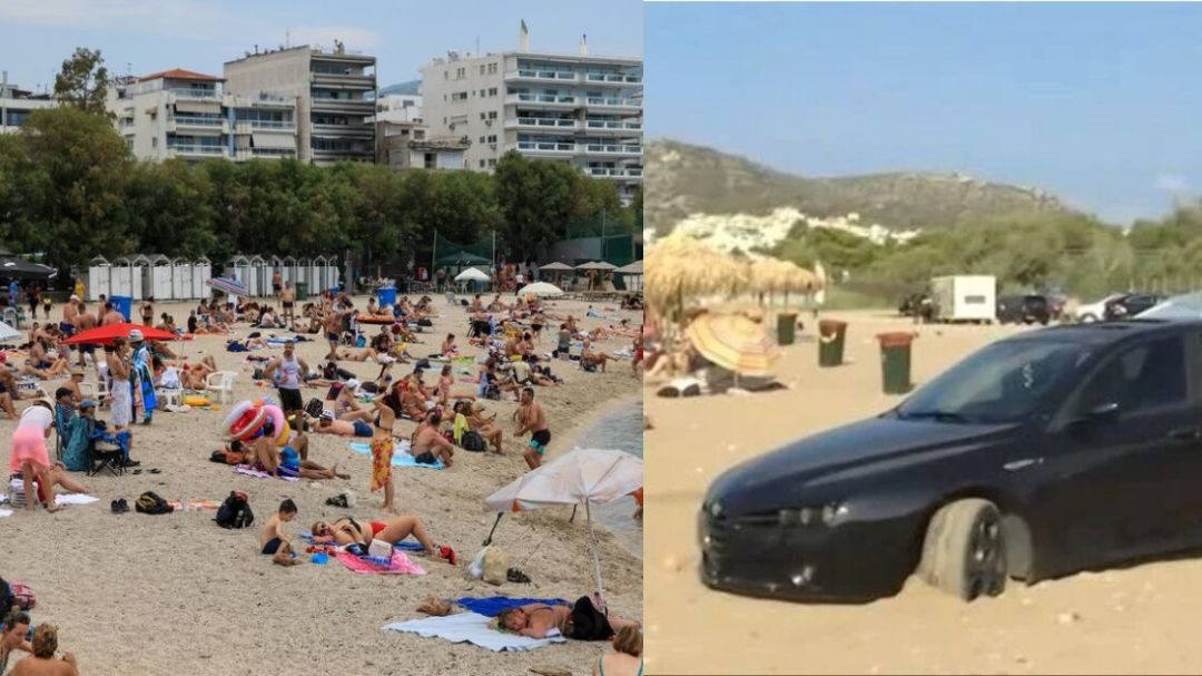 Όπως κατέγραψε η κάμερα του ΣΚΑΪ, την ώρα που οι παραλίες κατακλύζονται από λουόμενους, ένα αυτοκίνητο φαίνεται να είναι σταθμευμένο δίπλα από τις ξαπλώστρες της παραλίας.
