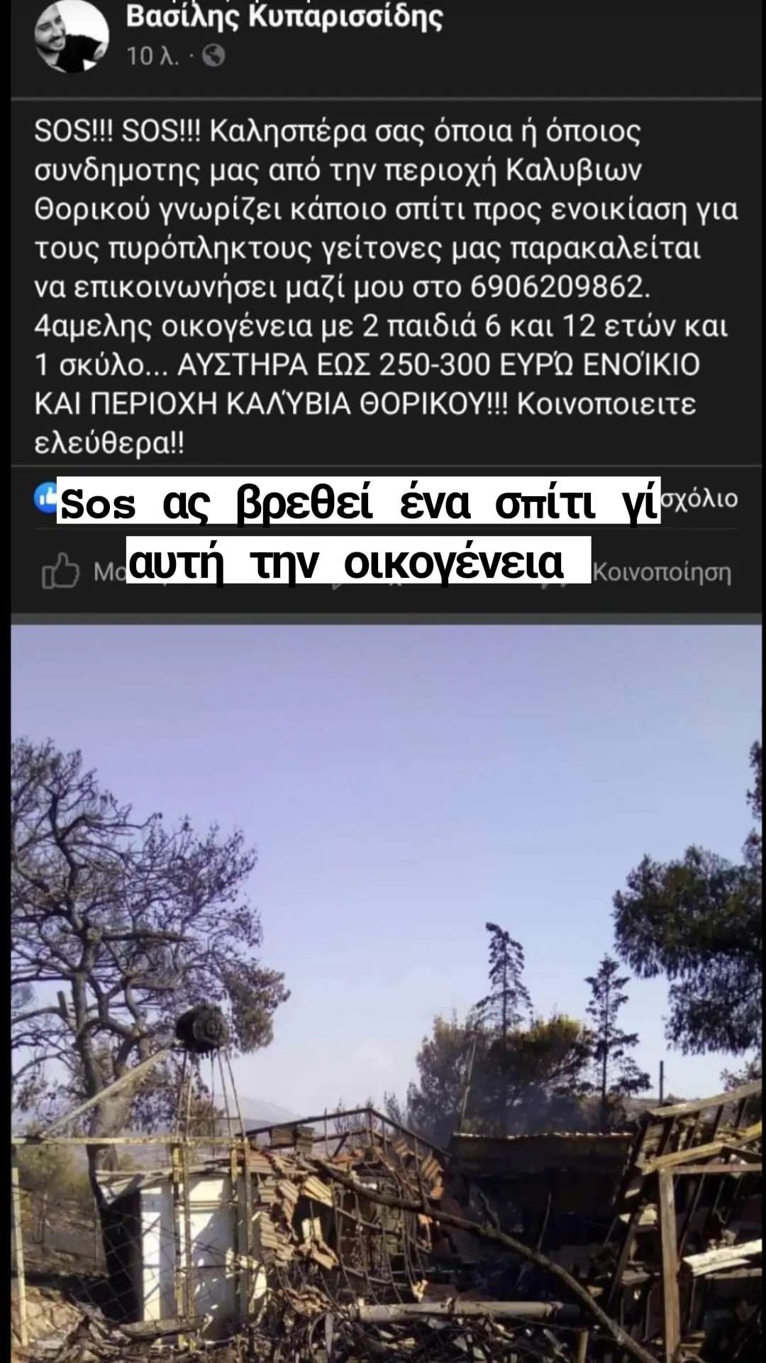 «Το σπίτι τους, όπως βλέπετε, κάηκε ολοσχερώς… Μιλώντας τώρα με τον πατέρα της οικογένειας, που φιλοξενείται προσωρινά σε διπλανό σπίτι, μου είπε ότι δεν έχει μείνει τίποτα… Πως έχουν ανάγκη ακόμα και απο βασικά είδη καθημερινής ανάγκης των παιδιών… (ρούχα, παπούτσια, παιχνίδια, οικοσυσκευές, ΤΑ ΠΑΝΤΑ).