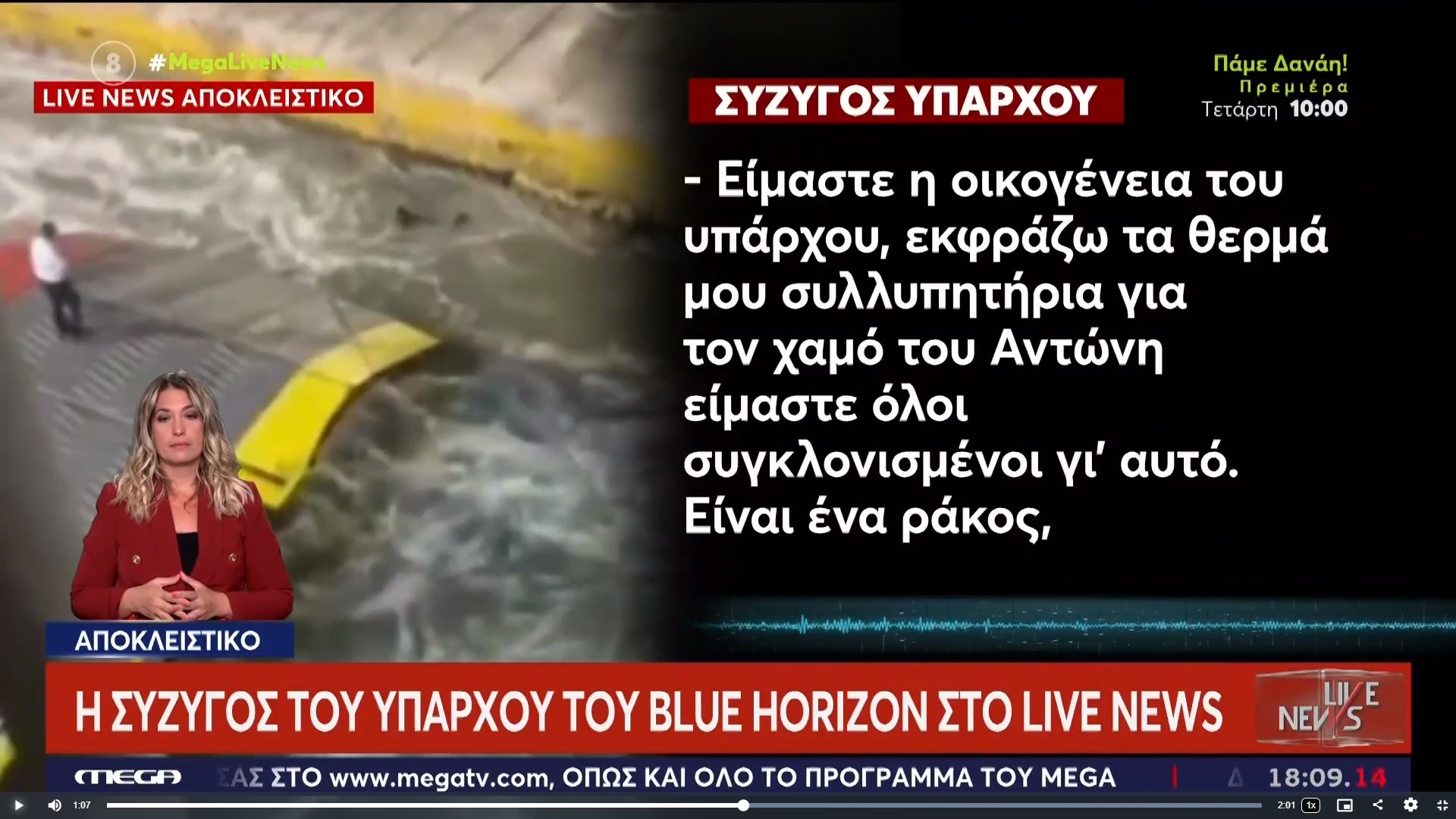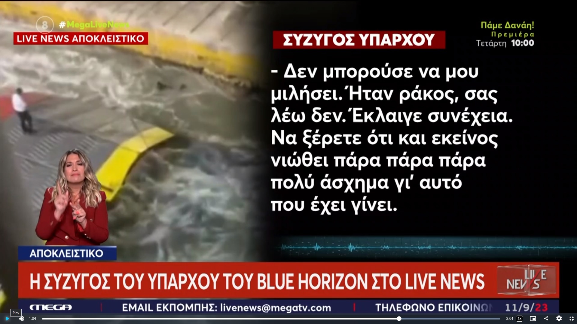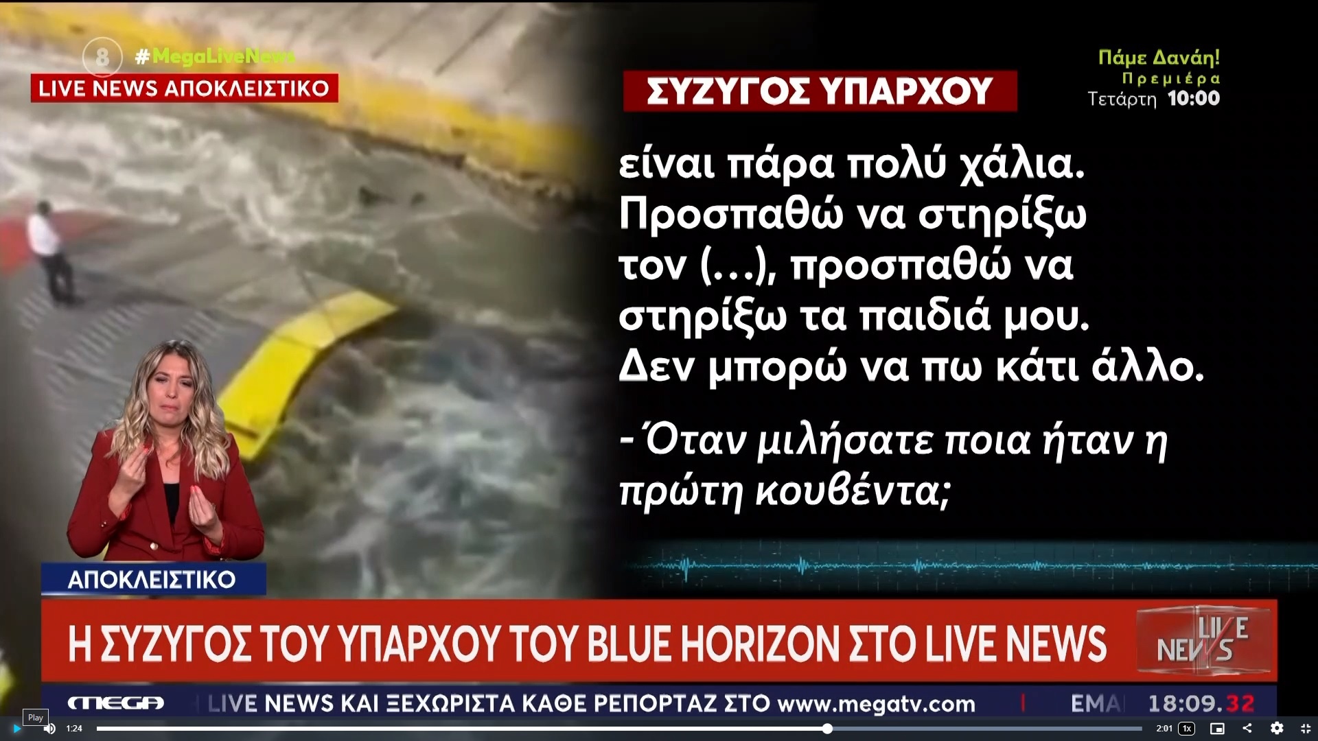 Όταν πηγαίνω και τον βλέπω για ένα τέταρτο, δεν μπορώ να κάθομαι και να τον ρωτάω τι και πώς έγινε. Πρέπει να τον στηρίξω, γιατί σας λέω ότι είναι ψυχολογικά ράκος», παραδέχεται στον αέρα του ΑΝΤ1 η σύζυγος του ύπαρχου στο μοιραίο Blue Horizon.
