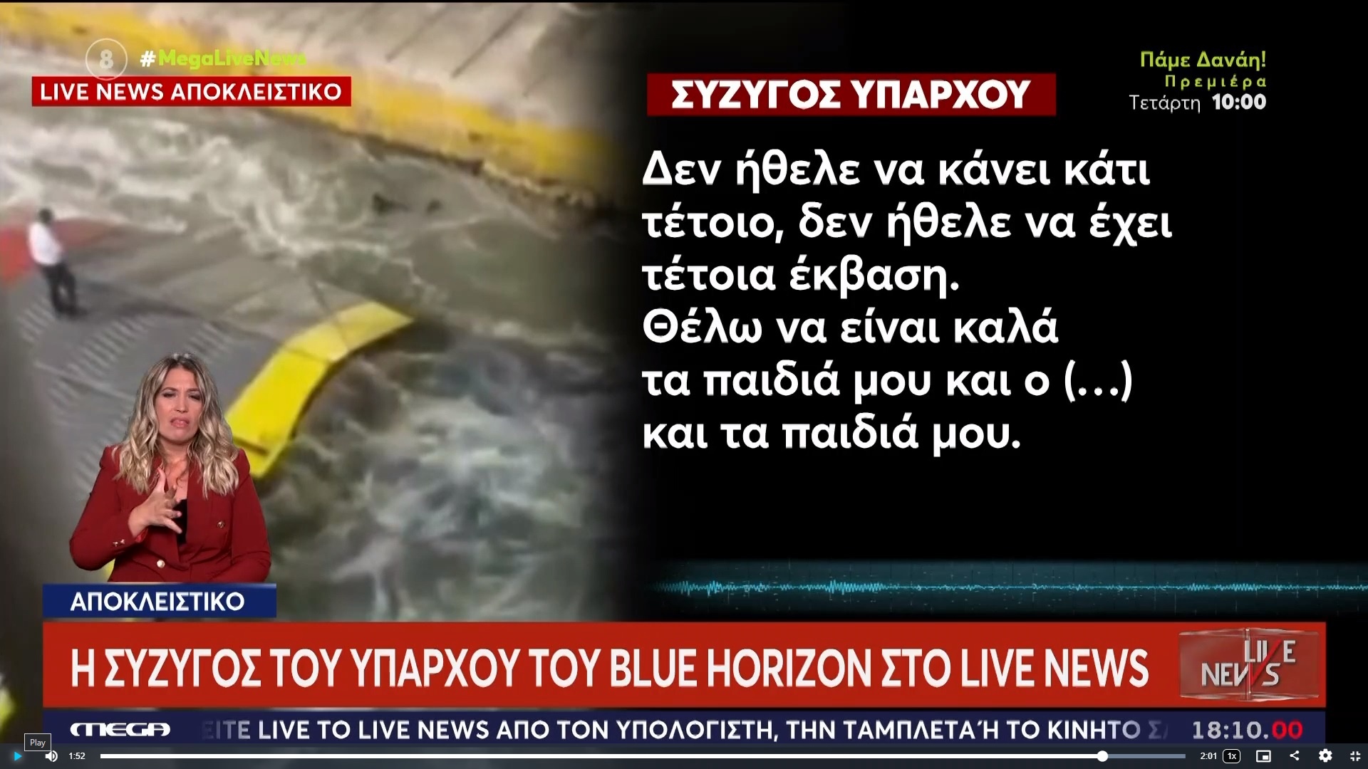 «Τον άντρα μου τον είδα όταν τον είχαν στην Ασφάλεια. Δεν ξύπνησε ένα πρωί και είπε: σήμερα θα κάνω κακό σε κάποιον άνθρωπο. Είναι πολύ δύσκολη η κατάσταση, προσπαθώ να φανώ δυνατή για τα παιδιά μας, για τον ίδιο. Πρέπει να μπορέσουμε να συνεχίσουμε», αναφέρει ξεσπώντας σε λυγμούς η σύζυγος του κατηγορούμενου ύπαρχου του Blue Horizon.