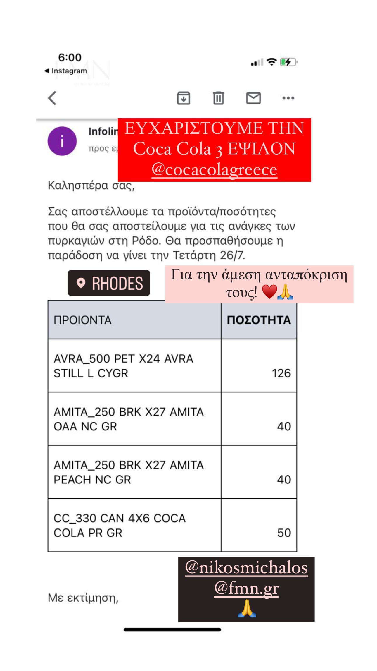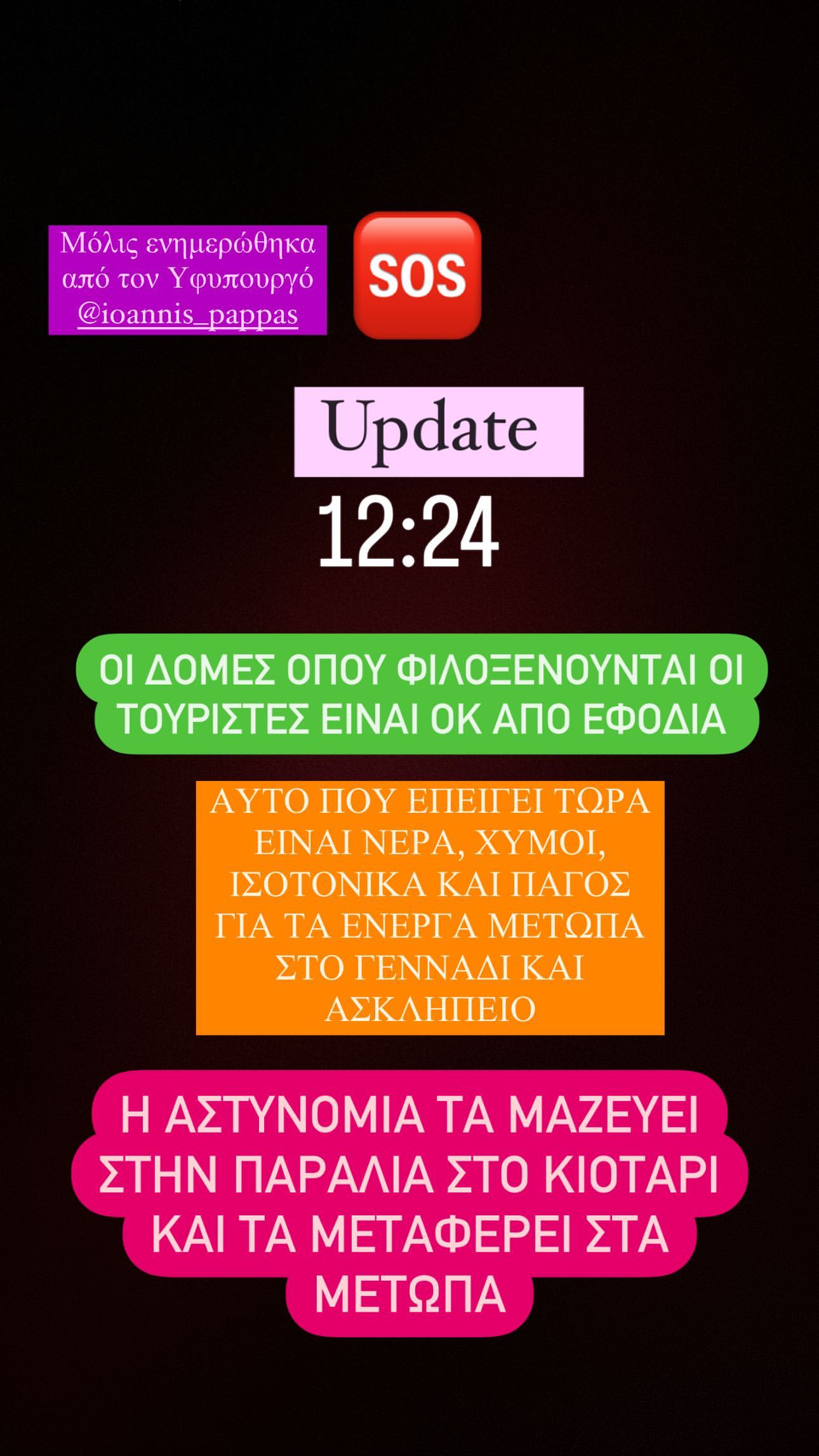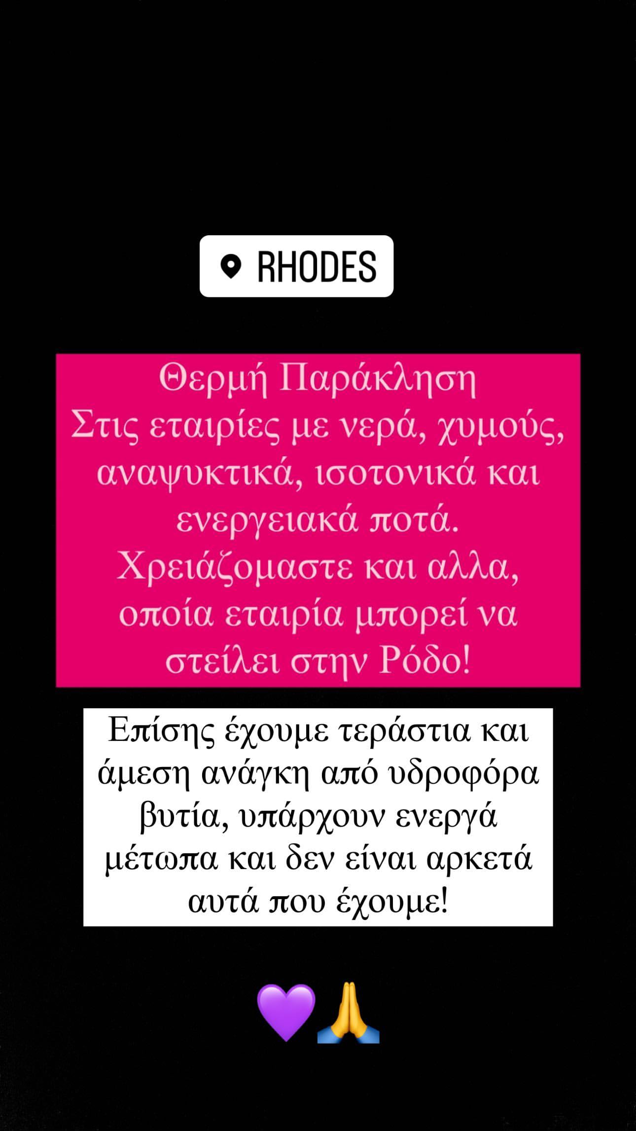 Στο τελευταίο του μήνυμα, το πρωί της Δευτέρας 24/7 αναφέρει: «Το μόνο που έχουμε είναι ο ένας τον άλλον! Συγχαρητήρια σε όλους που βοηθάνε με τον τρόπο τους! Υπάρχει μεγάλη παραπληροφόρηση στα social media. Θα ενημερωθώ σύντομα για το τι χρειάζεται και που, και μέσω efood άτομα εκτός Ρόδου μπορείτε να στείλετε προμήθειες (θα ανεβάσω διευθύνσεις σύντομα)» έγραψε χαρακτηριστικά.