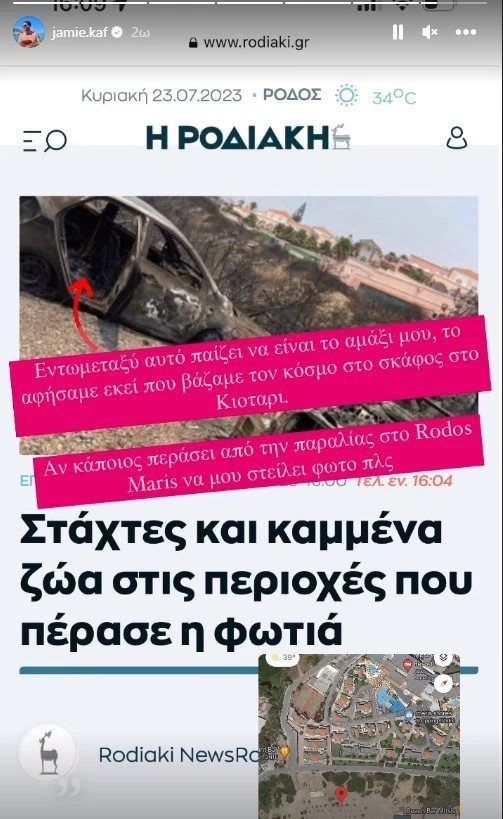 Ο εφιάλτης συνεχίζεται στη Ρόδο μετά τη φωτιά που ξέσπασε στο νησί. Ο Τζέιμς Καφετζής που βρίσκεται εκεί, παρέχει βοήθεια για μετακινήσεις κόσμου και μάλιστα μοιράστηκε στο Instagram νέες εικόνες καταστροφής.